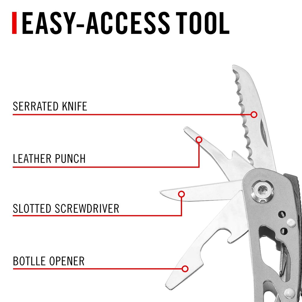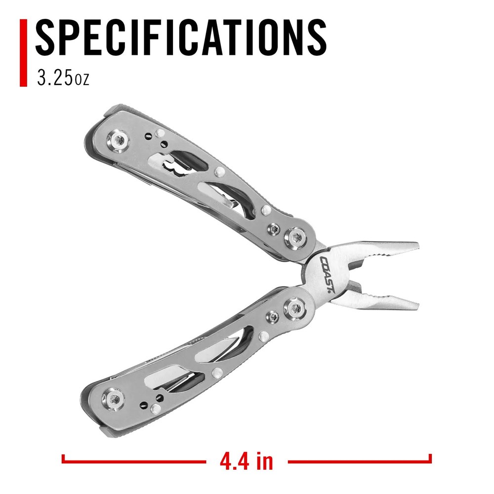 Be job-site ready with the COAST CT211, a precision-built 11-in-1 stainless steel multitool engineered for tradespeople, outdoor professionals, and multitaskers who demand reliability. With spring-loaded needle-nose pliers and heavy-gauge wire cutters, dual-knife blades (straight-edge and serrated), multiple screwdriver heads (mini flat, full flat, Phillips), plus practical extras like a bottle opener, file, nail cleaner and leather punch - it’s all housed in a tough, sand-blasted stainless steel frame that opens to 112mm (4.4") and yet remains compact for everyday carry. Rated with a lifetime warranty, the CT211 is built for durability and to deliver performance when you need it most.