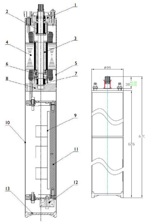 The motor uses rare earth permanent magnets, and has a built-in electronic unit comprising a frequency converter and motor controller. Vector control and MPPT are used to select the best operating point for the pump, based on the energy available from the input source.